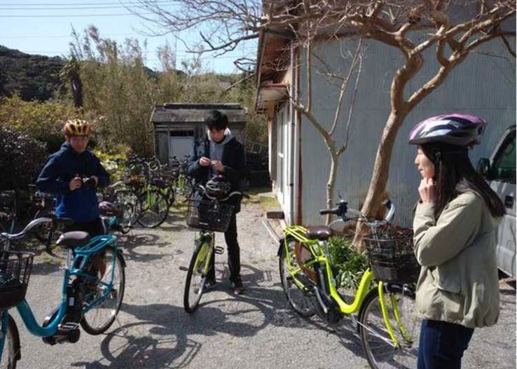 <式根島の民宿げんべいでの電動自転車のレンタル準備状況>