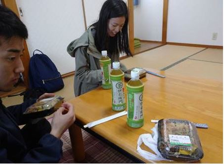 <式根島の最初のお昼の様子:民宿でお弁当で昼食。>