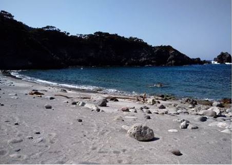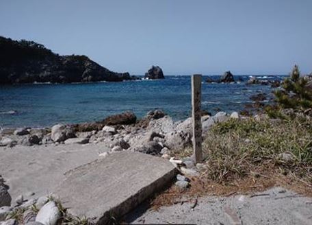<式根島・泊海岸:八丈島へ島流しになった豊臣五大老の宇喜多秀家も停泊した海岸です。>