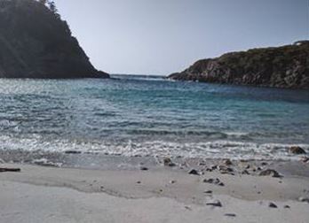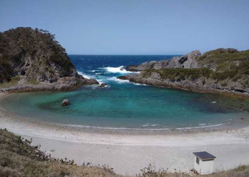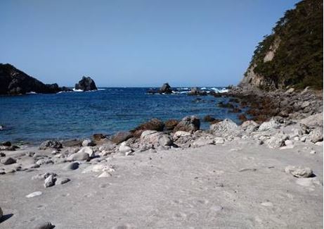 <式根島・泊海岸:雰囲気はとても良い入り江の海岸です。>