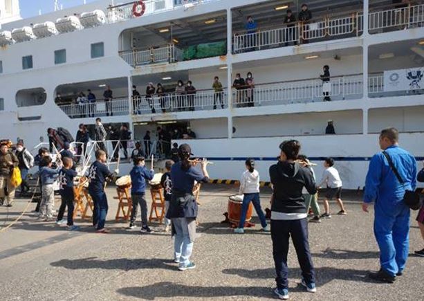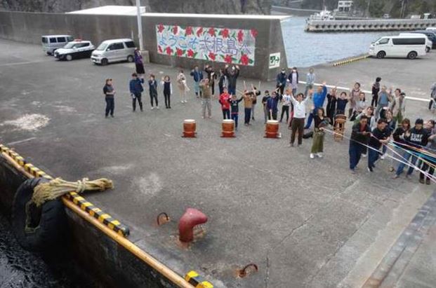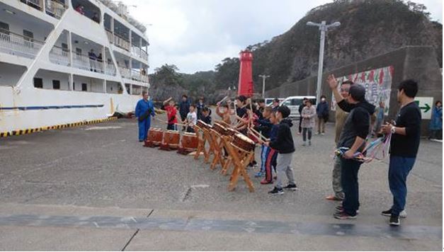 <式根島の野伏港:サルビア丸の到着に合わせた地元の子供の太鼓の向かい入れ>