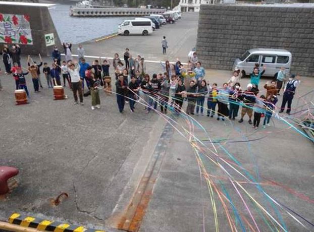 <式根島・野伏港:サルビア丸の出港を祝う式根島の地元の方々の様子です。>