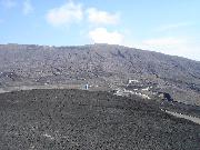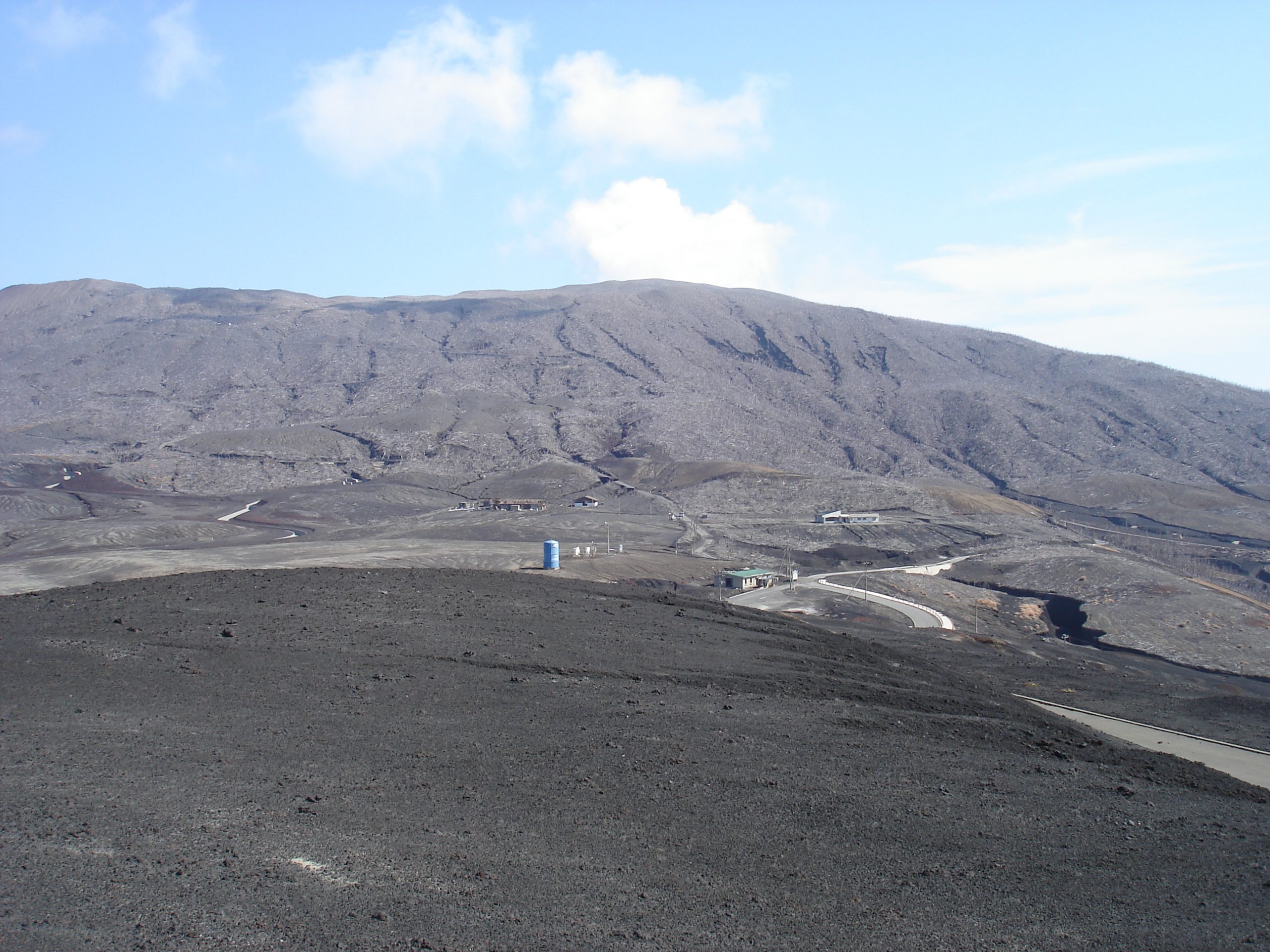 草も生えない火山岩地や溶岩で溶けたコンテナ、鉄柵を見ながら