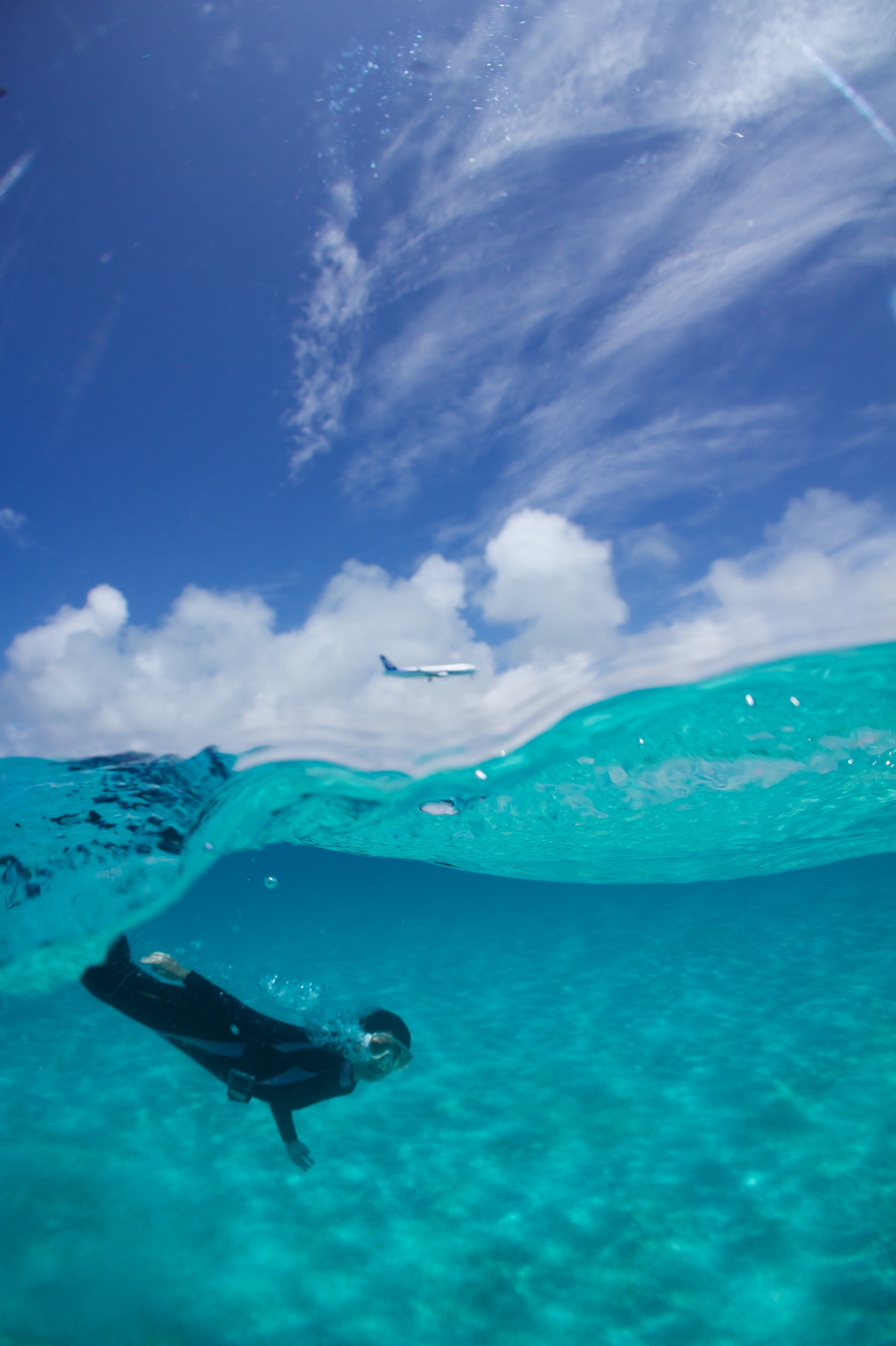 さらに、今回は地上には航空機、水中にはモデルが泳いでるという構図を目指したため、撮るのが大変なことに。。