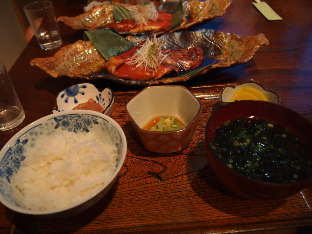 お昼に食べたアジ刺身定食、民宿自慢のお魚料理はとてもおいしかったです。