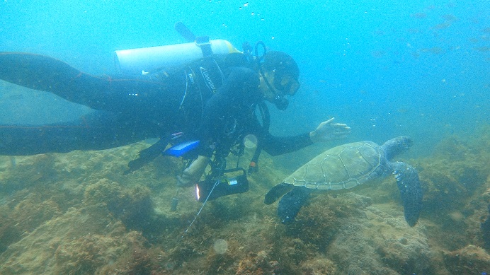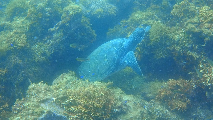 南の海では時々出会うアオウミガメですが、伊豆の川奈で見るのはまた格別の感動です。