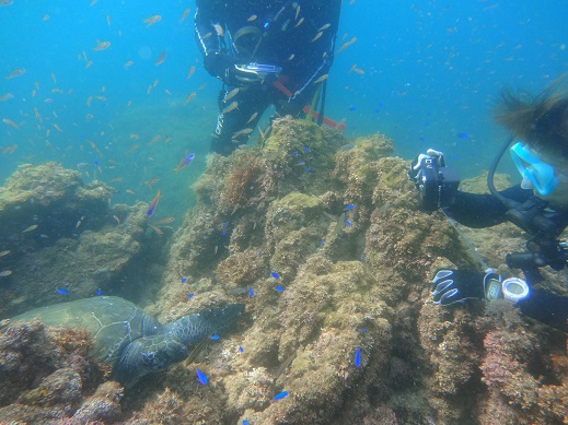 ところで、昨年から川奈には、2匹のウミガメが住みついて、多くのダイバーたちを虜にしています。