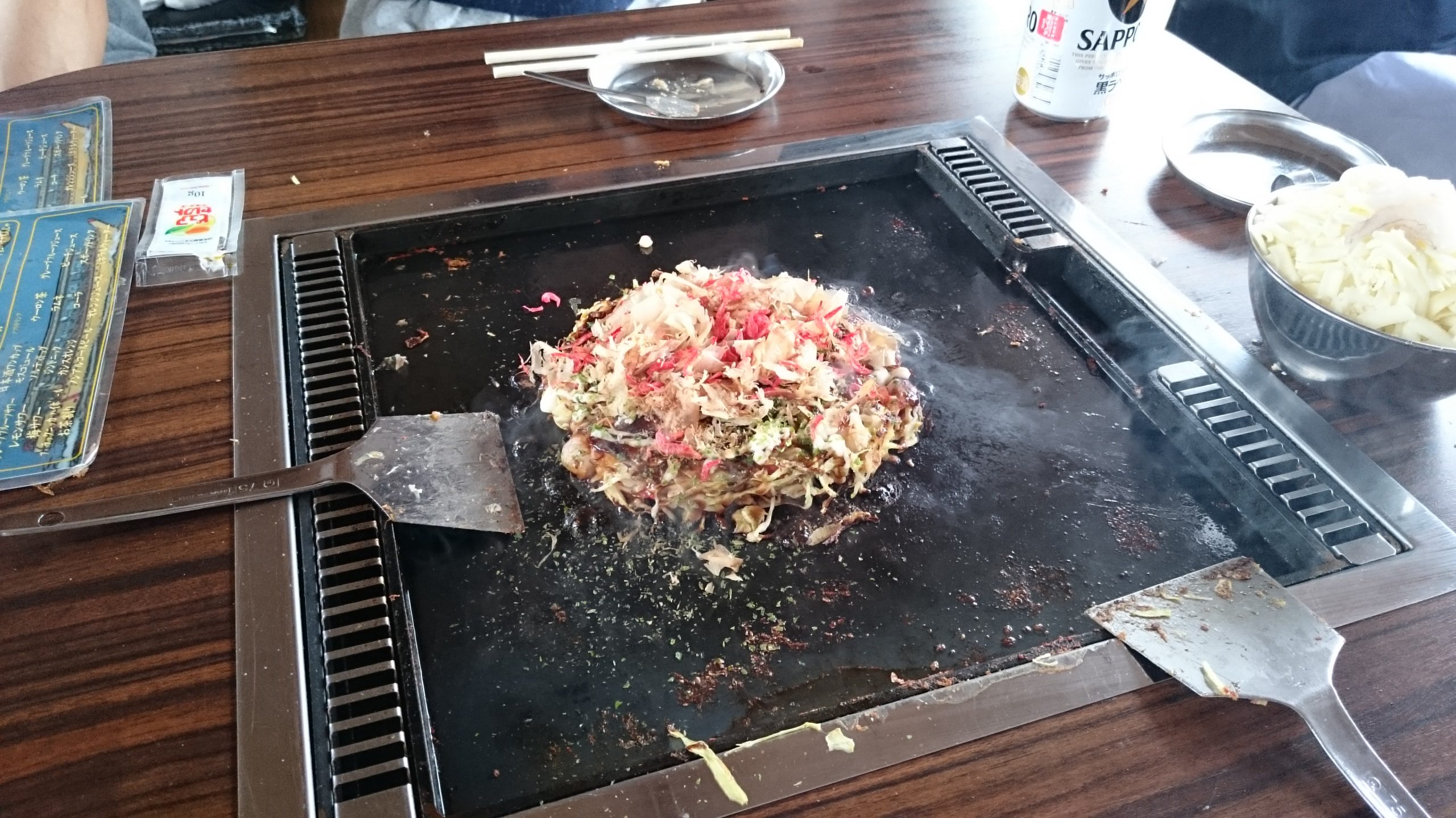 キャベツなどの具材をしんなりするまでいため、細かくヘラで刻んで土手を作り、その中に汁を入れて蒸発させ、ペタペタして食べるのですが・・・