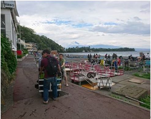 <大瀬崎駐車場から、大瀬崎湾内のポイントまで台車で移動している画像です。>