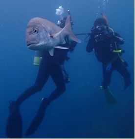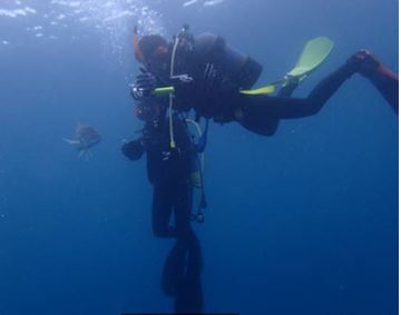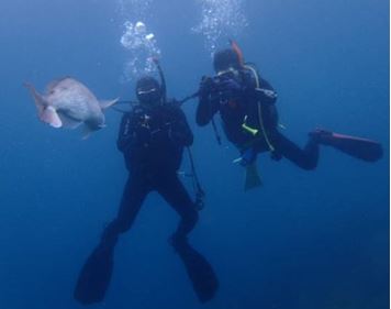 <安全停止の水深5メートルあたりでの様子:Y田さん、Y下さんです。マダイのダイちゃんの水中画像を撮ろうとされてました。>