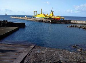 <潜る前の旧八重根港の様子です。強い北東風が吹いた事で、珍しく八重根の港に橘丸が来ました。あいかわらず、旧八重根のビーチポイントは、凪の状態です。>