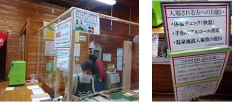<ふれあいの湯のコロナ対策の状況です。ここでも、非接触で体温測定、代表者が施設入場票へ記入後に提出でした。>