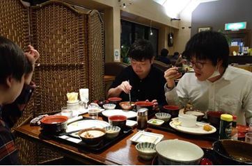 <サンライズ大瀬崎での夕食の様子: Mさん、M松さん、ソーシャルディスタンスをやや取っています。>